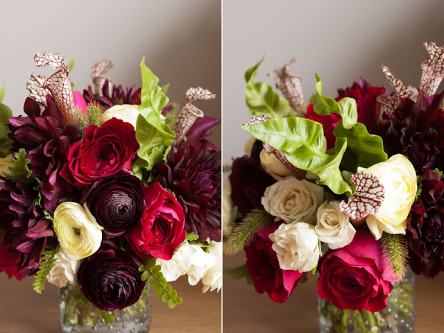 a dose of drama is good every once in a while; too much will give you agita. this is perhaps one of the more exotic arrangements i've done -- sarracenia, crispy wave ferns, darcey garden roses, near-black dahlias and some beloved ranunculus.